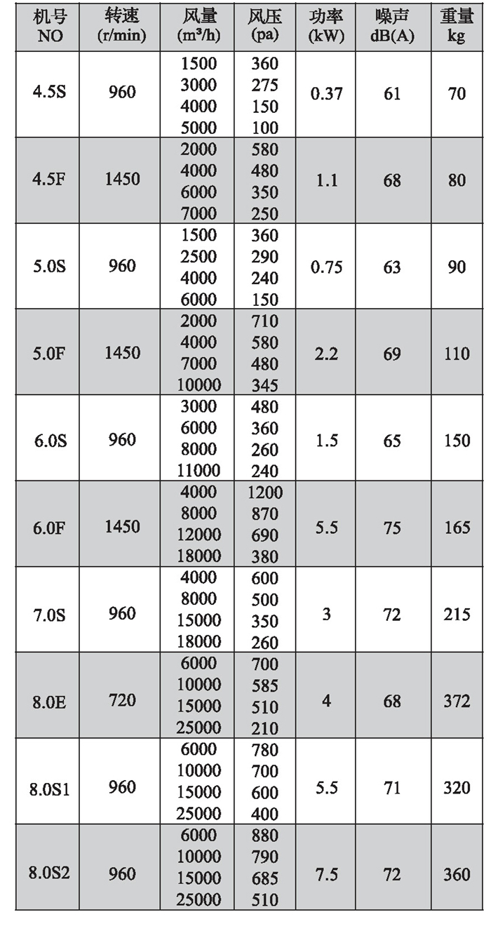 注:雙速風(fēng)機(jī)重量參考同號(hào)中高速風(fēng)機(jī)的重量。