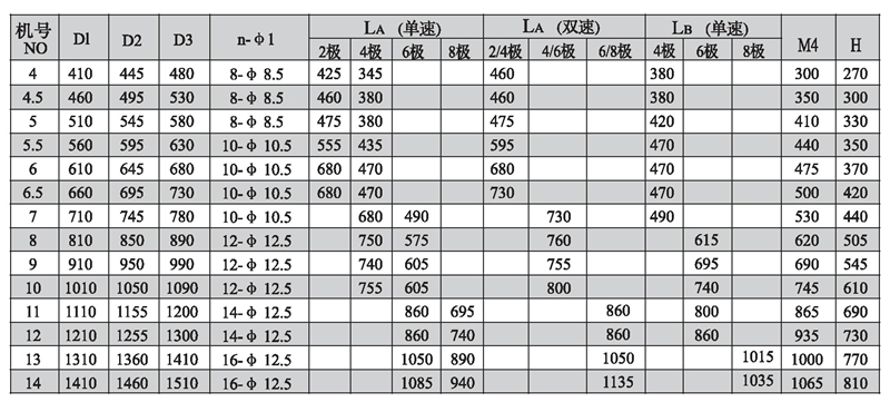 2.風(fēng)機(jī)出廠時(shí)法蘭一般不打孔n-φ1僅供參考,若要打孔請(qǐng)用戶在訂貨時(shí)說(shuō)明。