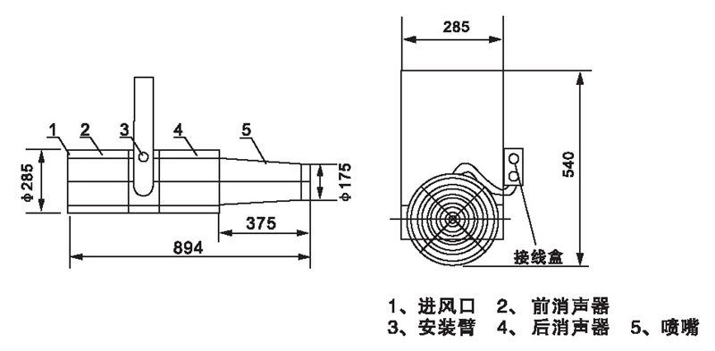 無(wú)箱軸流誘導(dǎo)風(fēng)機(jī)由軸流風(fēng)機(jī)、消聲器、噴嘴、固定架組成,回轉(zhuǎn)角度<60”,噴口φ175。