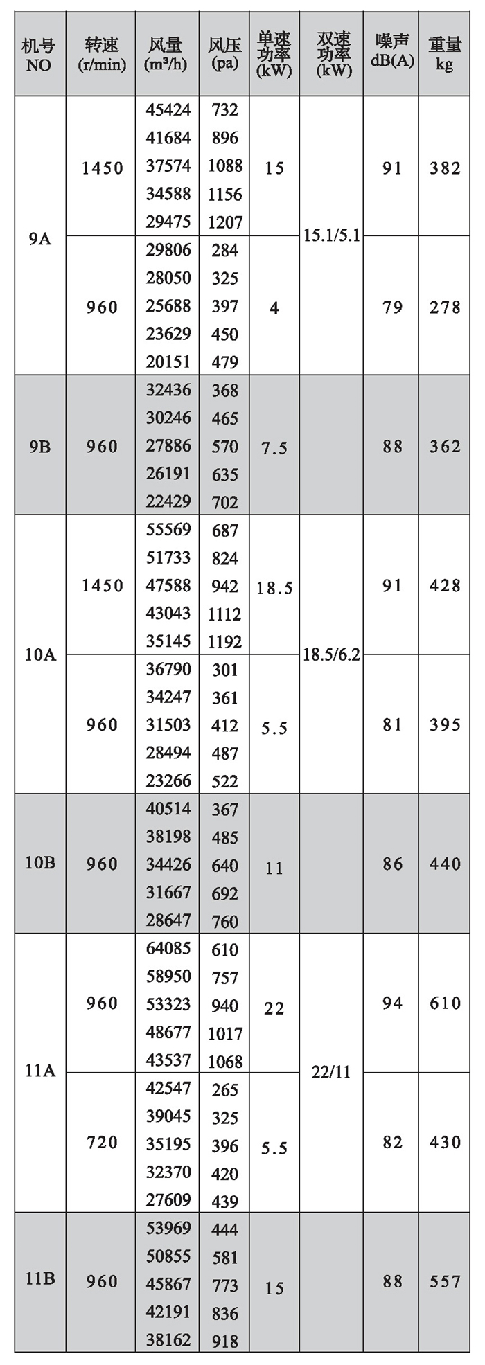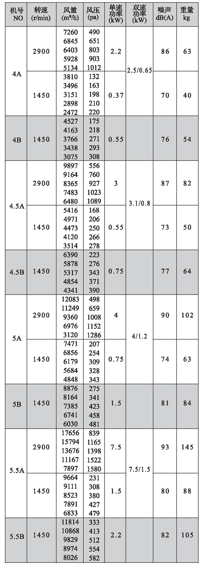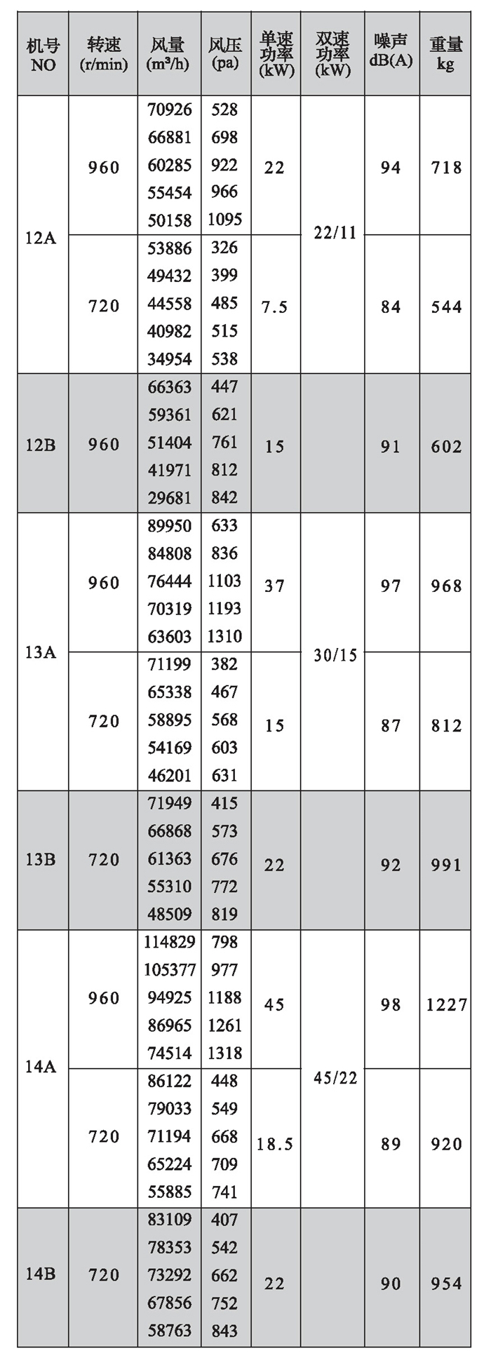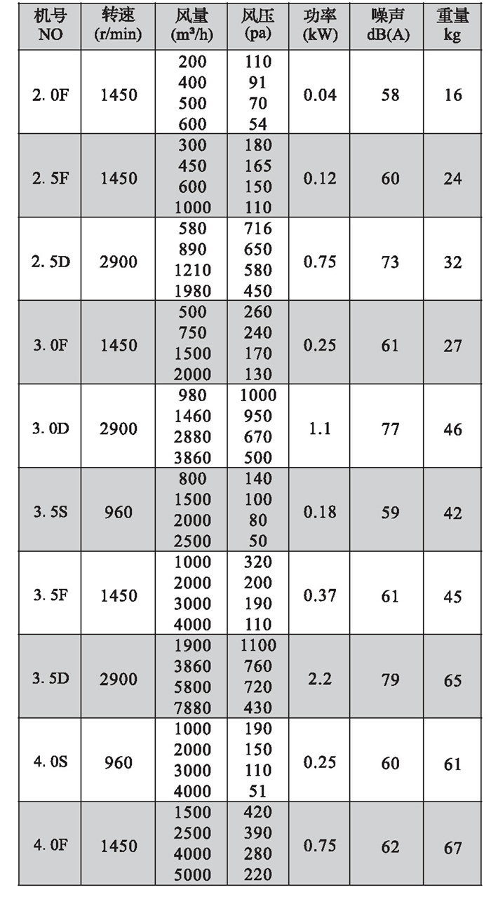 注:雙速風(fēng)機(jī)重量參考同號(hào)中高速風(fēng)機(jī)的重量。