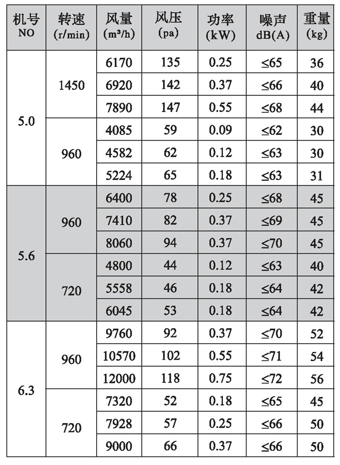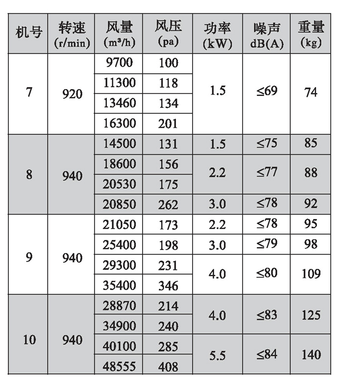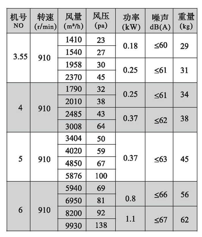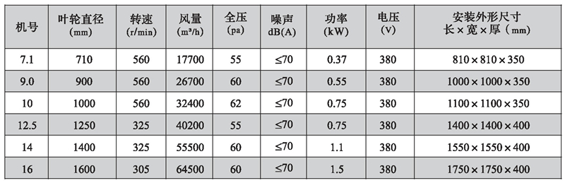 三、DFBZ型風(fēng)機(jī)外形尺寸表(單位: mm)